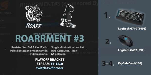 Suomalaista turnausperinnettä ihailtavasti ylläpidetään myös muiden kuin Hearthstone.fi:n toimesta. Jesse “Roarr” Kailan Roarrment-turnaussarja sai jatkoa jo kolmannella iteraatiollaan ja täyttyi ennätysajassa. Palkintoina tuotepalkintoja ja mainetta riittivät viemään turnauksen päätyyn saakka.