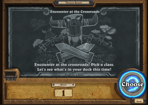 Muutama viikko sitten nähtiin toisinto aikaisemmin pelatusta Tavern Brawlista. Tällä viikolla Encounter at the Crossroads tekee myös paluun, jossa pelaaja valitsee classin ja decki täytetään satunnaisilla minioneilla.